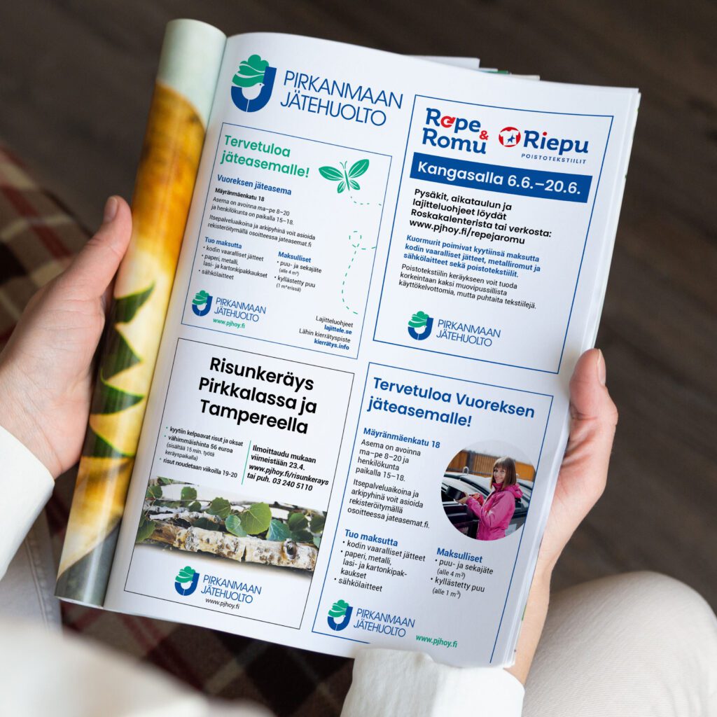 Pirkanmaan Jätehuolto on yksi vakioasiakkaistani. Suunnittelen heille vuosittain kymmeniä lehtimainoksia heidän oman visuaalisen ilmeensä mukaisesti.