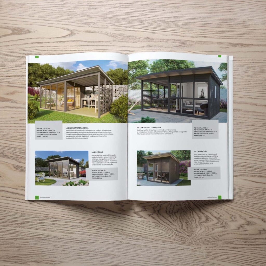Katalogissa esitellään kattavasti Jalotakan piharakennuksia. Laadukkaat kuvat helpottivat ulkoasun uudistusta ja taittoa.