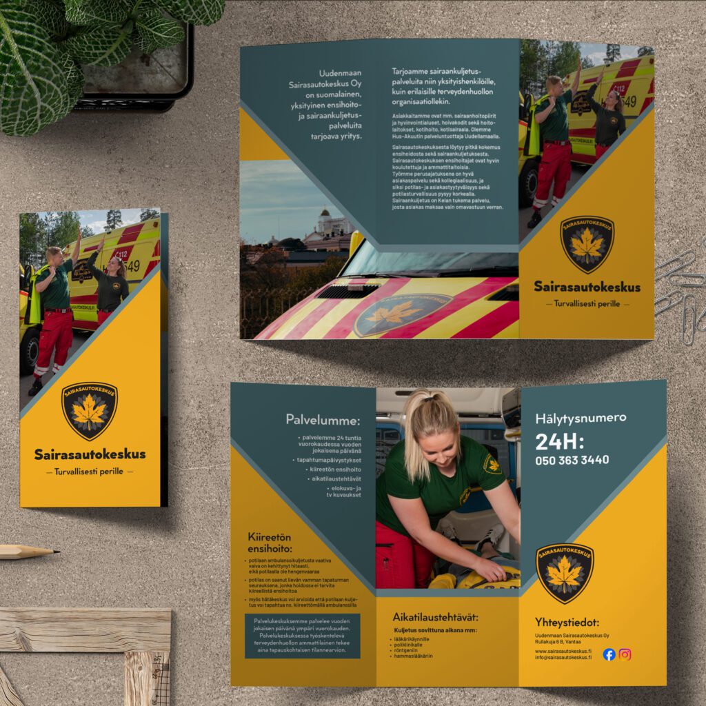 Sairasautokeskuksella oli valmiiksi suunniteltu yritysilme, jonka mukaisesti suunnittelin heille esitteen taiton. Esite on kolmeen osaan taitettu A4-kokoinen.